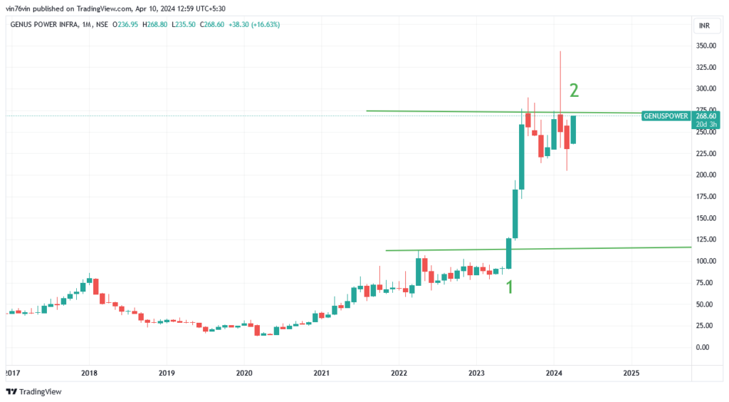 If we look at the charts of Genus Power Infrastructures Ltd, we can see a pattern evolving like the one we saw in 2023 (Point 1)