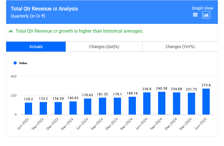 Anand Rathi Wealth Ltd. Jun-2025 Quarterly Revenue is Rs 274 Cr which is growth of 15.7% YoY.