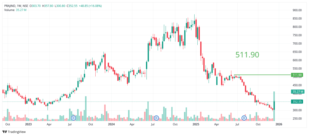 Praj Industries’ shares surged 7.2% to ₹357.80, a two-month high, on Tuesday, doubling the two-day gain to 18%.