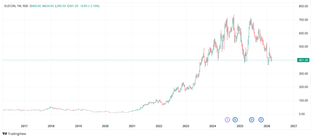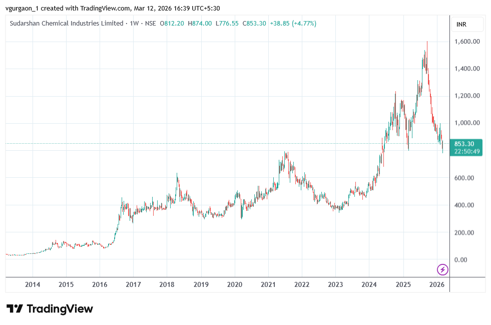 The stock touched an all time high of Rs. 1603 in Sept 2025 and now it is trading at Rs. 853, down about 46% from it’s all time high.