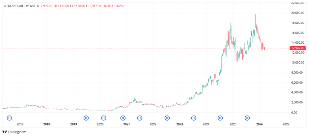 The stock touched an all time high of Rs. 19747 in Nov 2025 and now it is trading at Rs. 12918, down about 34% from it’s all time high.