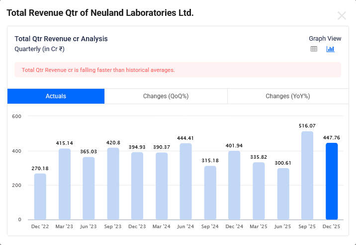 Neuland Laboratories Dec-2025 Quarterly Revenue is Rs 448 Cr which is growth of 11.4% YoY.