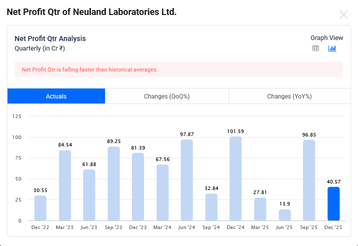 Neuland Laboratories Dec-2025 Quarterly Net Profit is Rs 41 Cr which is growth of -60.1% YoY.