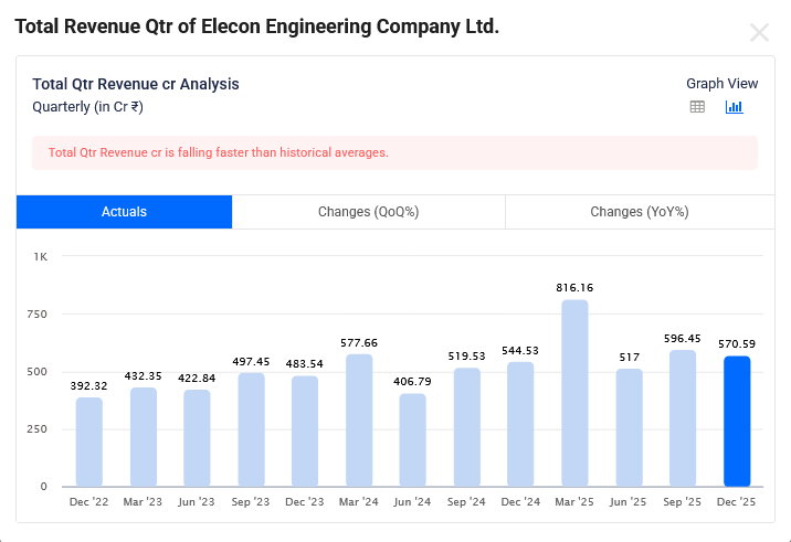Elecon Engineering Dec-2025 Quarterly Revenue is Rs 571 Cr which is growth of 4.8% YoY.