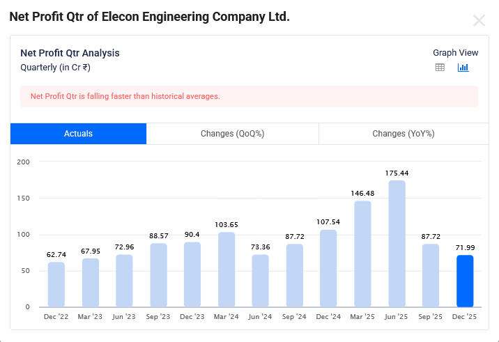 Elecon Engineering Dec-2025 Quarterly Net Profit is Rs 72 Cr which is growth of -33.1% YoY.