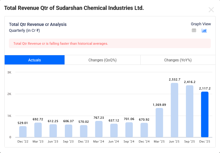 Sudarshan Chemical Dec-2025 Quarterly Revenue is Rs 2,117 Cr which is growth of 215.6% YoY.