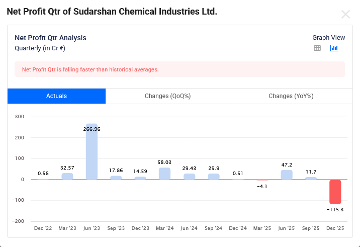 Sudarshan Chemical Dec-2025 Quarterly Net Profit is Rs -115 Cr which is growth of -22531.9% YoY.