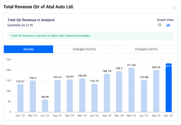 Atul Auto Dec-2025 Quarterly Revenue is Rs 231 Cr which is growth of 18.2% YoY.