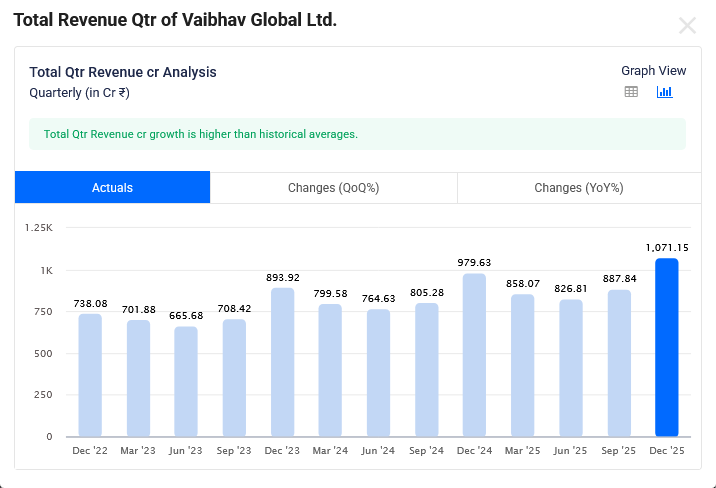Vaibhav Global Dec-2025 Quarterly Revenue is Rs 1,071 Cr which is growth of 9.3% YoY.