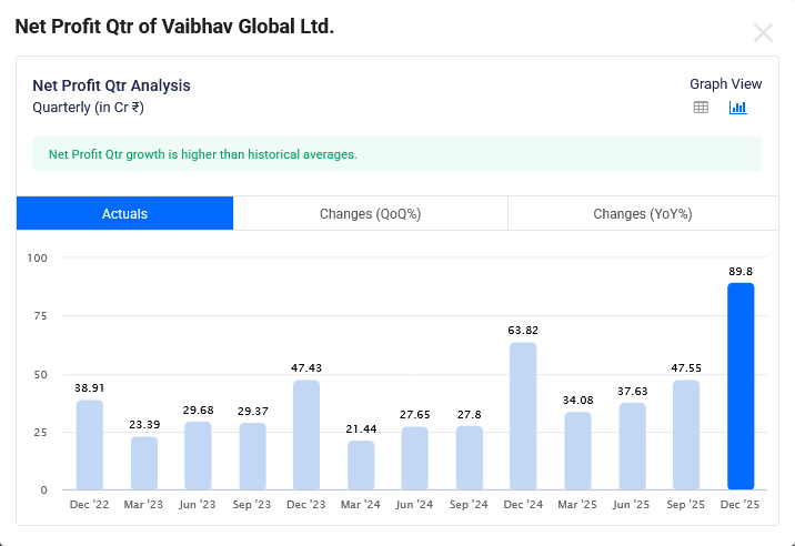 Vaibhav Global Dec-2025 Quarterly Net Profit is Rs 90 Cr which is growth of 40.7% YoY.
