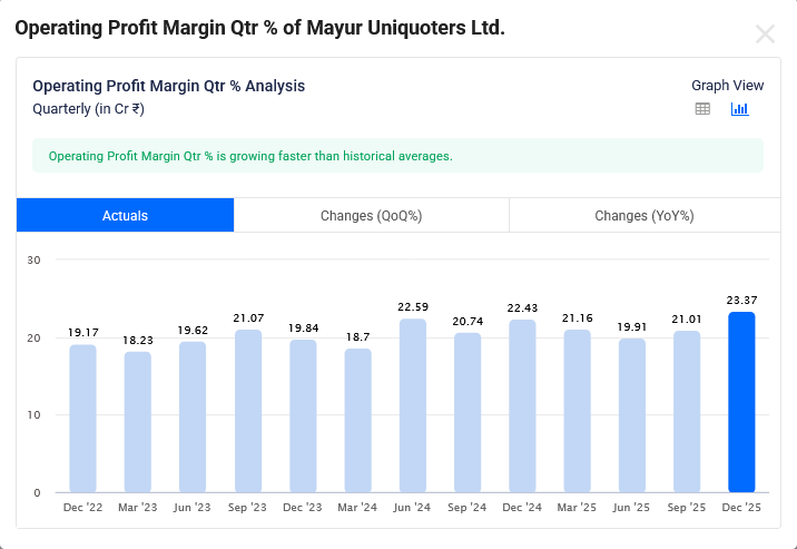 Mayur Uniquoters Dec-2025 Quarterly operating profit margin % is 23.37% which is growth of 4.16% YoY.